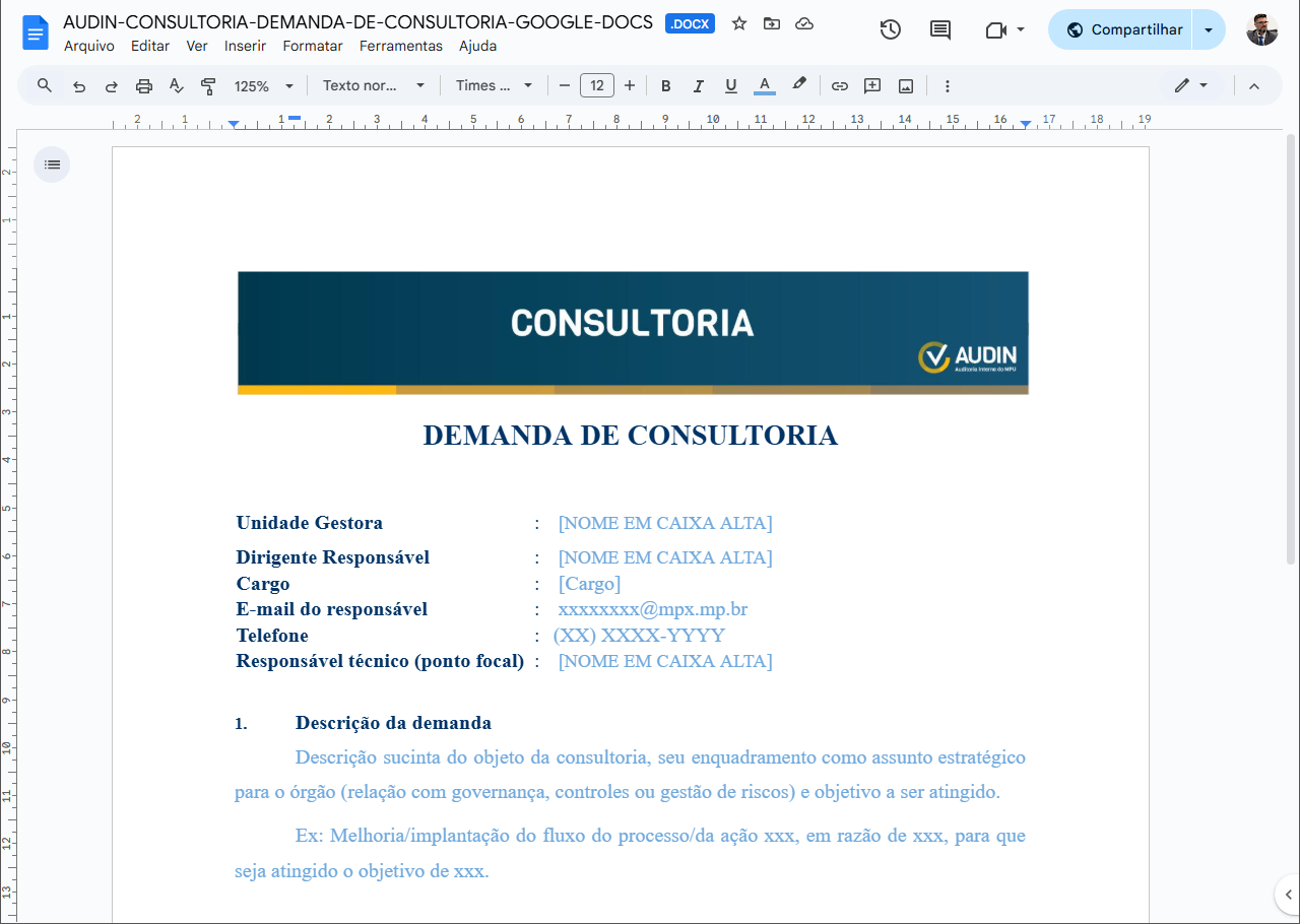 A demanda deve ser subscrita por representante da alta gestão da unidade demandante e encaminhada via Sistema Único, por meio do modelo de documento AUDIN-CONSULTORIA-DEMANDA-DE-CONSULTORIA-GOOGLE-DOCS, do Tipo DEMANDA DE CONSULTORIA, de Abrangência Nacional, ou pelo Protocolo Eletrônico do MPF , conforme o este modelo de documento.